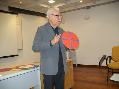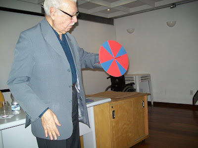 Luminosidade, percentual de cor, vibração, percepção... conceitos que Pedrosa precisou explicar demonstrando algumas experiências de sua pesquisa.